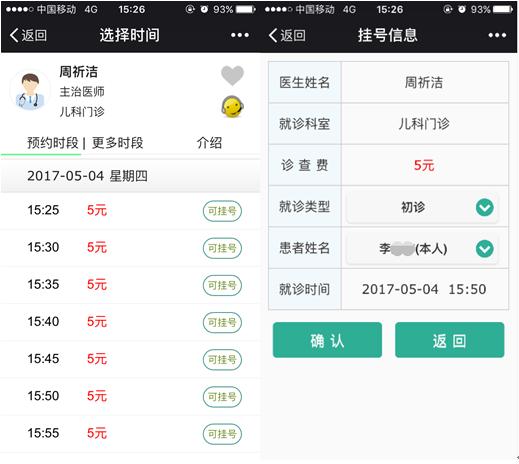 就诊服务>>预约/挂号>>选择科室>>选择日期>>选择挂号的医生>>选择挂号的时间>>预约/挂号信息>>确认>>微信支付挂号